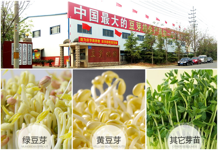 5、豆芽機產品特點: 1)我公司生產的全自動綠色無污染豆芽機,是現代技術與傳統工藝的結合。豆芽機通過微電腦自動控溫、自動加溫、自動顯示溫度、自動淋水,實現了生產過程的全自動化,具有省時、省工、低耗、無噪音等特點。 2)用我公司豆芽機生產的豆芽比傳統手工生產周期短質量好,一般手工生產豆芽的周期,夏季需4-5天,冬季需要7-8天,而豆芽機生產豆芽只要3-4天即可,且不受地理環境、氣候條件和季節的影響。 3)我公司豆芽機生產的豆芽不僅種類多,而且產量高,一斤豆種可生產10斤左右的豆芽。且人工控制的環境下,豆芽生長均勻一致,潔白鮮嫩、清脆多汁,口感清爽;不僅食用安全、營養豐富,還具有一定的食療保健作用。 4)節省勞力,操作方便。將浸泡后的豆種放進豆芽機育芽箱內,就不用管了,它會自動加溫,自動淋水,經過3-4天時間就可生產出潔白脆嫩的豆芽。