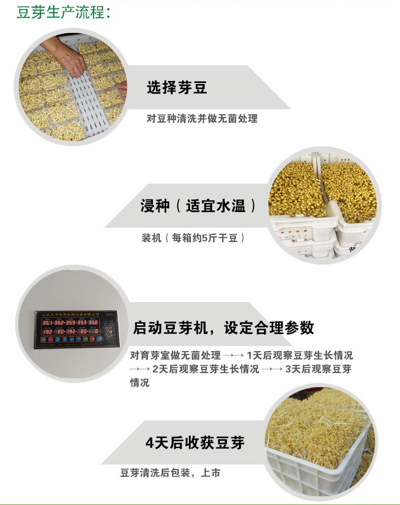 選擇芽豆 →→ 對豆種清洗并做無菌處理 →→ 浸種(適宜水溫) →→ 裝機(每箱約5斤干豆) →→ 啟動豆芽機,設定合理參數 →→ 對育芽室做無菌處理 →→ 1天后觀察豆芽生長情況 →→ 2天后觀察豆芽生長情況 →→ 3天后觀察豆芽情況 →→ 4天后收獲豆芽 →→ 豆芽清洗后包裝,上市。